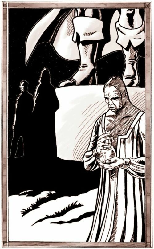 to a fragile jug of oil. "Who is that one, who offers no tribute, but draws within himself at the feet of the centuries?" The answer came, "He is Emperor Bor'gueesh II, the hereditary ruler of the Western lands. He refuses to learn the lessons of the centuries that inform the wise; refuses to lay tribute at their feet, believing himself to be above their tutelage and the sole source of his own wisdom. In his hands he carries a phial of rare and precious oil, the desire for which he used as his justification to depose the Eastern Emperor. As his family seized their own throne by deceit, so he now plots to seize rule of the East by that same means, despite having no means to hold on to them from half a world away. His is the rule of fear that brooks no dissent and recognizes no wisdom. " |